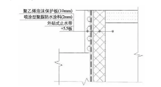 5) 側墻頂部回填土面以上,+5.5m標高以下部分,聚脲涂層需加厚至2mm,并需設置聚乙烯泡沫保護板,厚度l0mm。