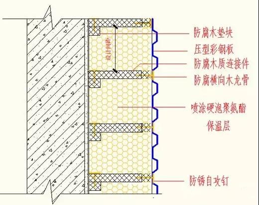 固定木龍骨(橫向木龍骨在最后一遍噴涂前安裝,一次噴涂約5-10mm,然后噴涂至設計厚度)——噴涂硬泡聚氨酯——安裝彩鋼板。