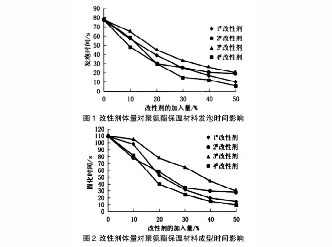 由圖1、圖2可知,加入四組改性劑之后,聚氨酯保溫材料的發泡及成型時間都隨著改性劑量的增多而減少。由此可得出結論,制備過程的反應速度與改性劑的反應體系有關,該實驗中的改性劑還有大量的聚酯多元醇,多元醇中的伯羥基能夠提高反應更慘中的活性,進而縮短了發泡及成型時間。