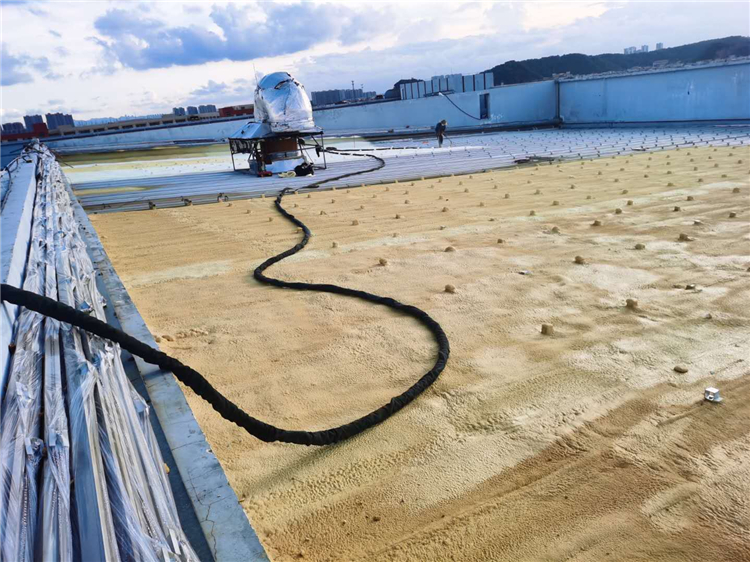 聚氨酯硬泡是一種具有閉孔結(jié)構(gòu)的低密度微孔泡沫材料,它的熱導(dǎo)率小,隔熱性能好,吸水率低,施工操作方便。我國在屋面上使用聚氨酯硬泡還處于起步階段,主要采用直接噴涂方式。一般在現(xiàn)場噴涂發(fā)泡成型,可在任何復(fù)雜結(jié)構(gòu)的屋面上作業(yè)。通常4~6人每天可噴涂泡沫15m3以上,按噴涂厚度為30mm計(jì),每天噴涂面積達(dá)500m2,為傳統(tǒng)材料的數(shù)倍。