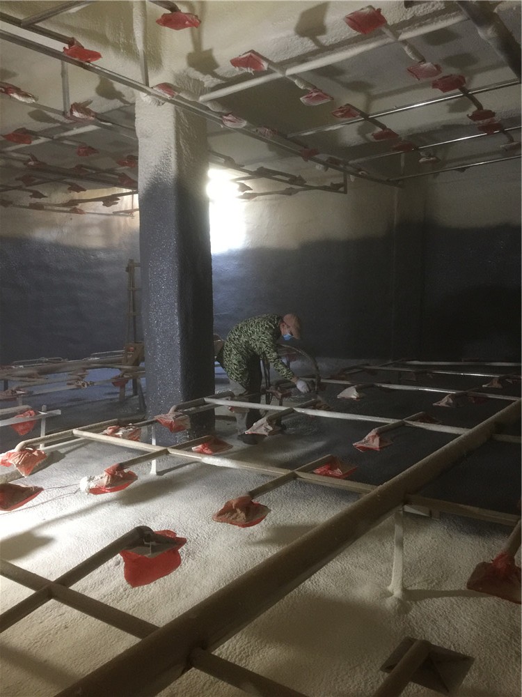 2、噴涂聚脲防水涂料不需催化劑,5~20秒凝膠,10分 鐘達到步行強度,可連續噴涂,一次施工厚度無限制,施工周期短、效率高。節點細部施工較方便,不需要專用纖維增強層。